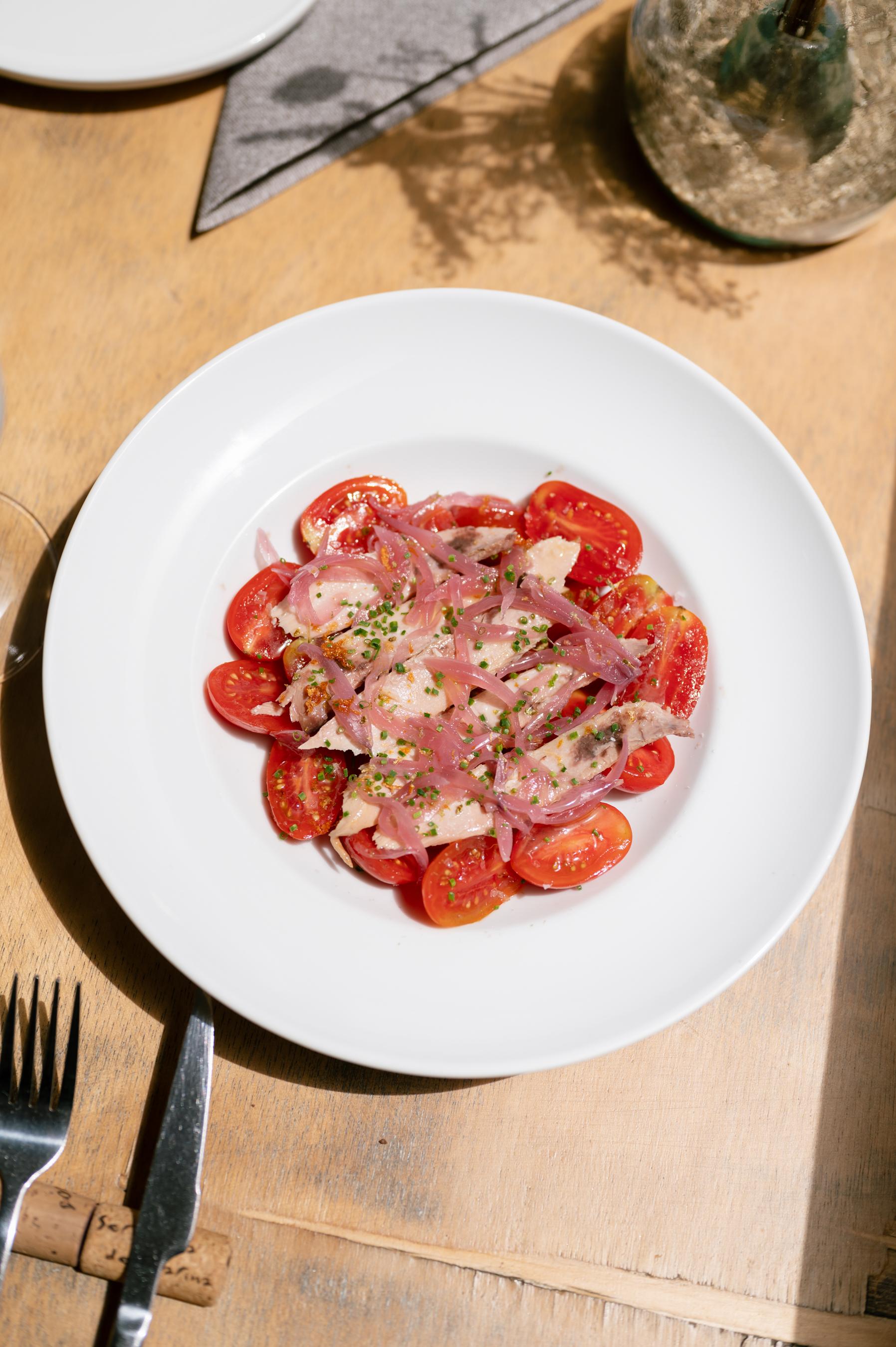 Ensalada de tomate cherry con ventresca de atún y cebolla osmotizada | O |